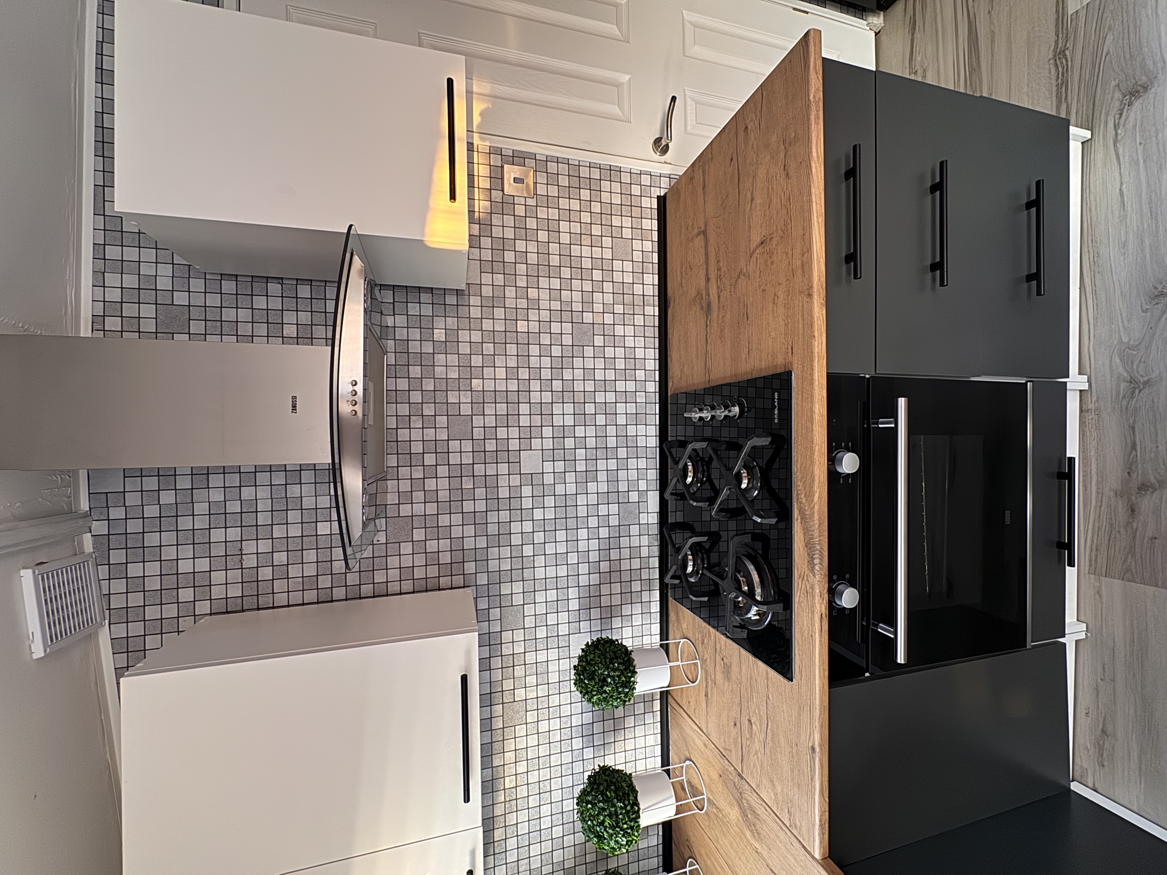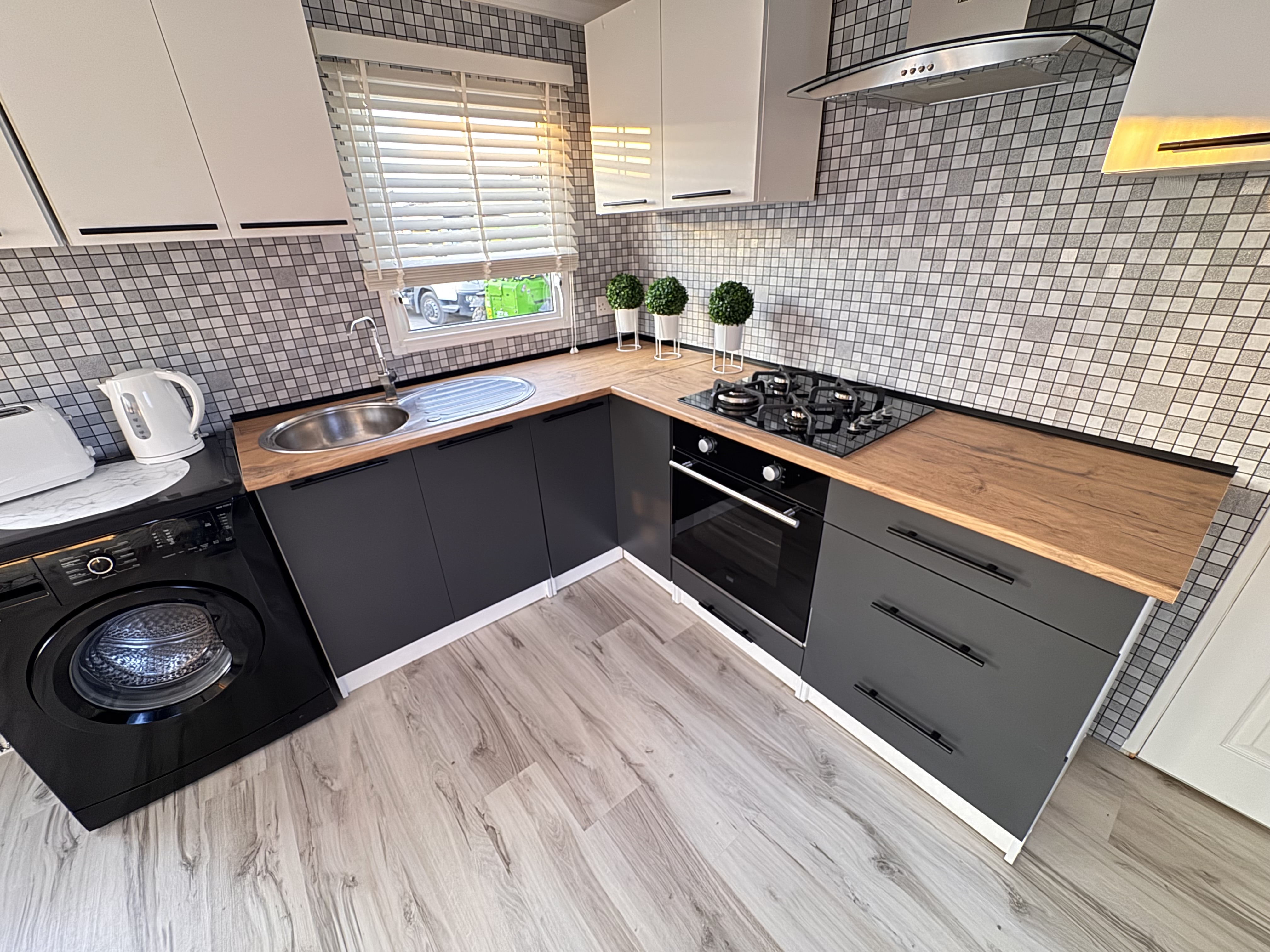 -KUCHNIA : Całkowicie Nowe meble , zlewozmywak , kuchnia gazowa 4 palnikowa z piekarnikiem , elektryczny okap , duża lodówka z zamrażalnikiem , pralka